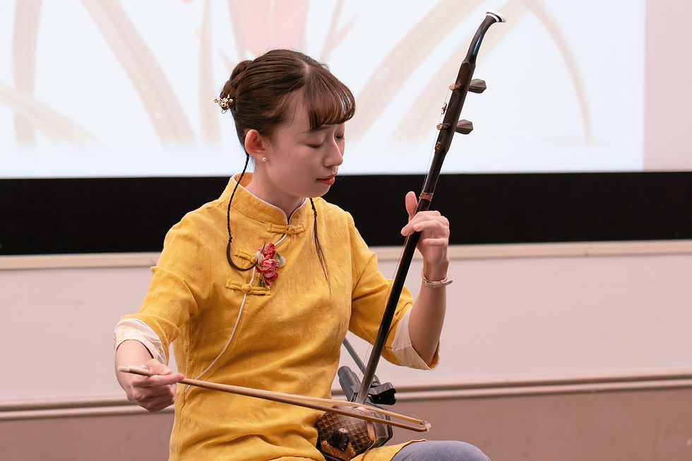 まずは琵琶の伝統的な武曲「十面埋伏」、そして文曲を代表する「月児高」です。力強い武曲と柔らかい音色の文曲を続けて披露し、雰囲気の違いを皆さまに感じていただけたと思います。